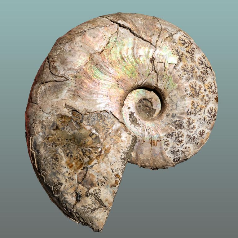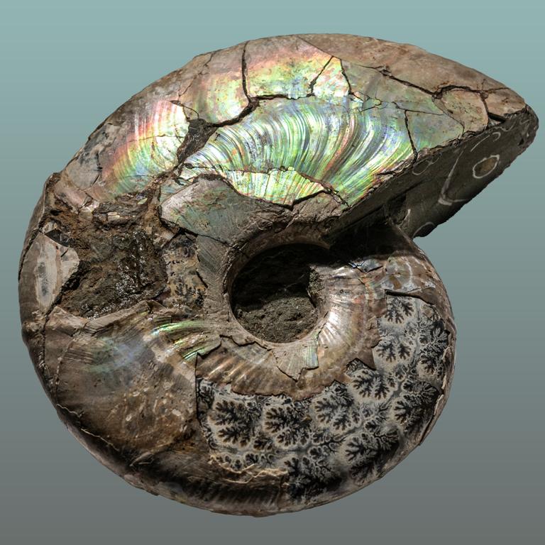 farbenfroher Ammonit – teilweise mit Schale, teilweise mit Lobenlinien