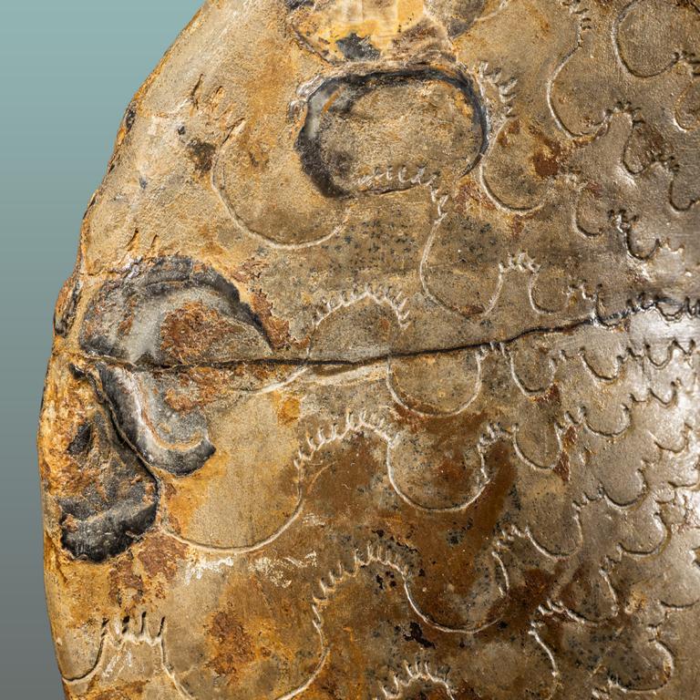 besondere scheibenförmige Form der Ceratiten aus dem Muschelkalk – mit großartigen Lobenlinien und Austerbewuchs